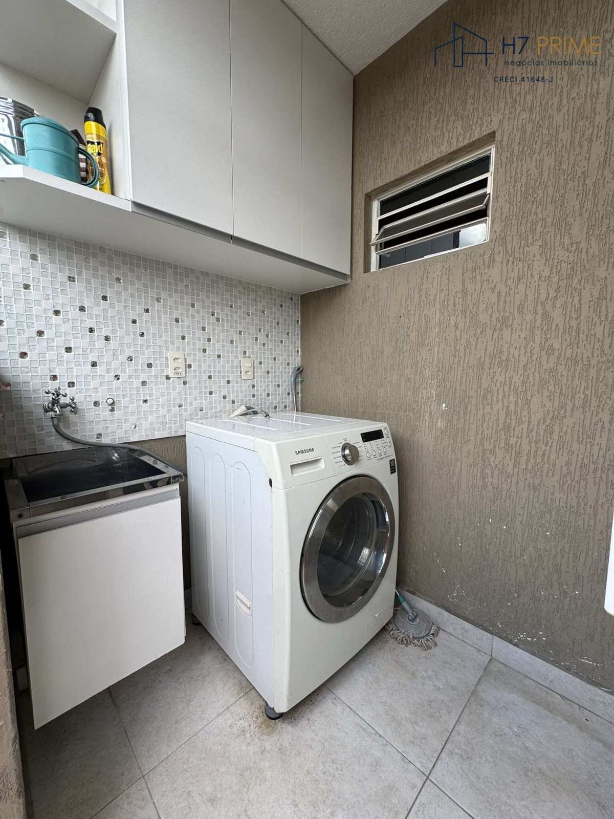 Lavabo e lavanderia equipada com máquina lava e seca, com acesso direto pela cozinha.