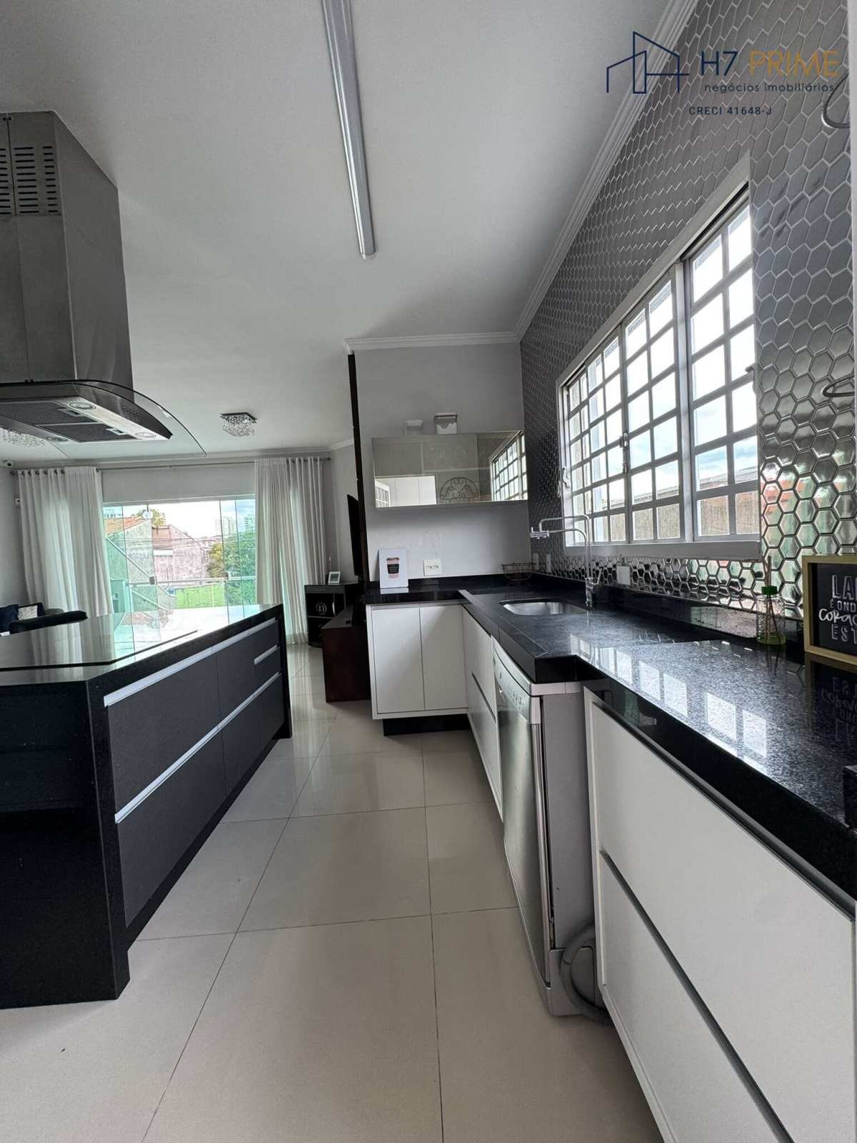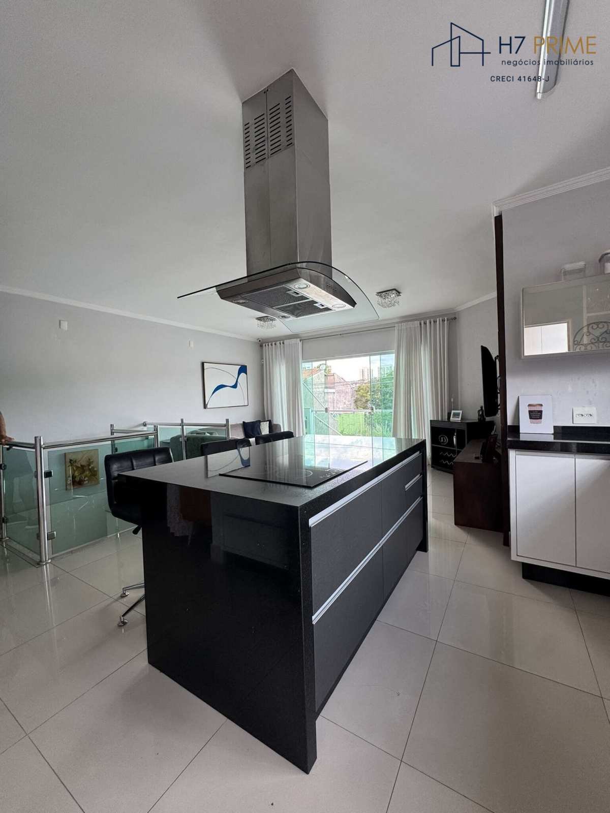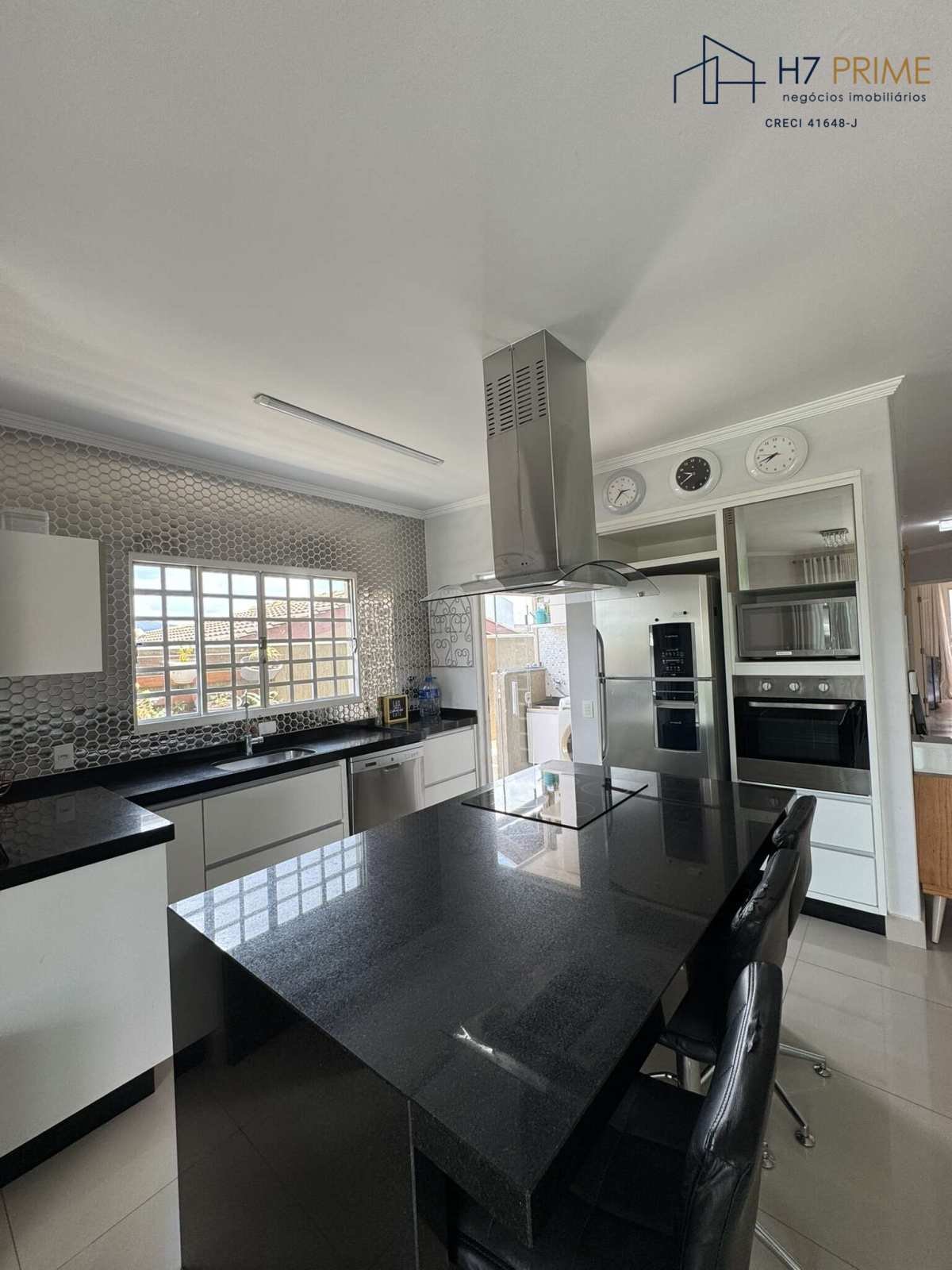 Cozinha moderna, equipada com ilha, cooktop, coifa, armários planejados e eletrodomésticos.