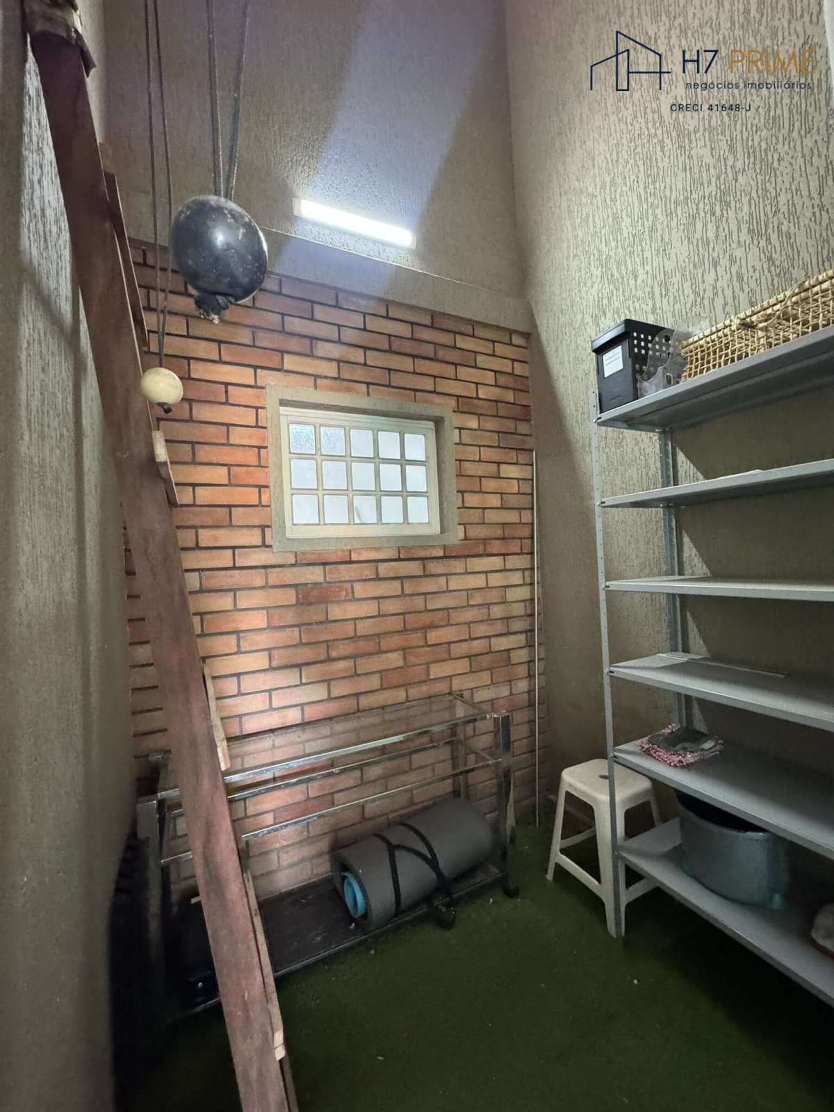 Depósito e armário sob a escada, otimizando cada espaço.