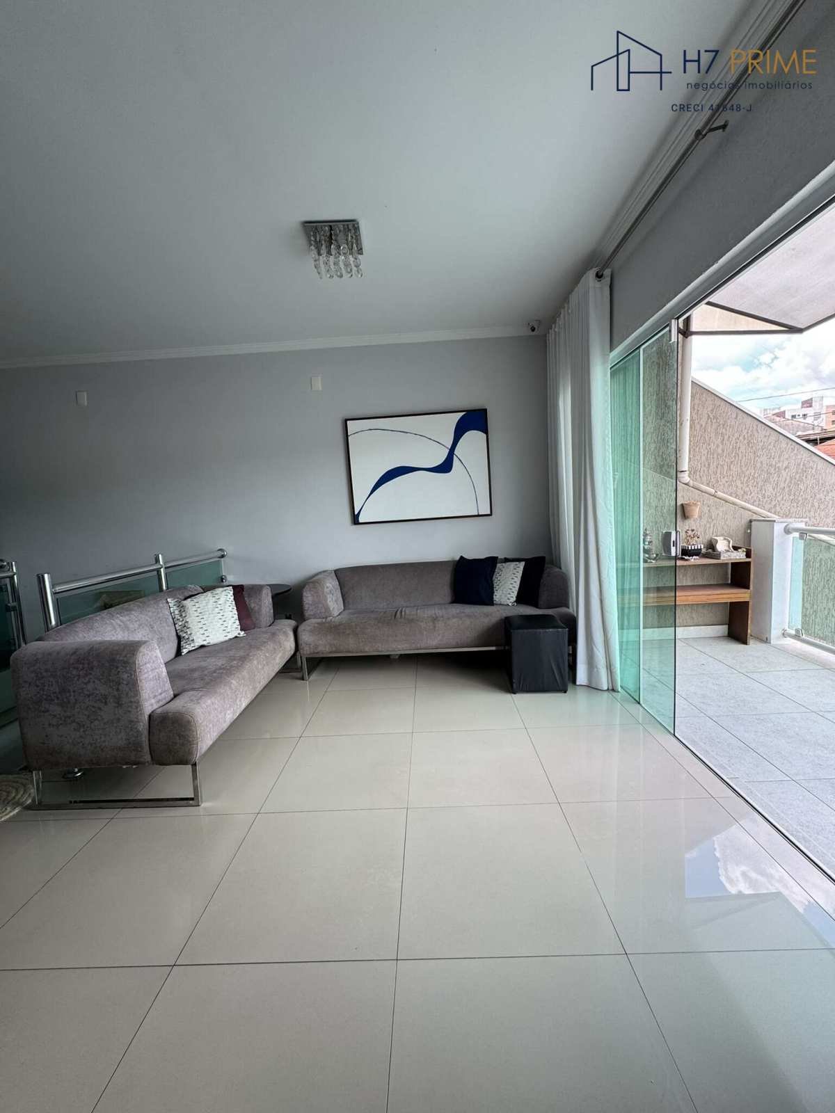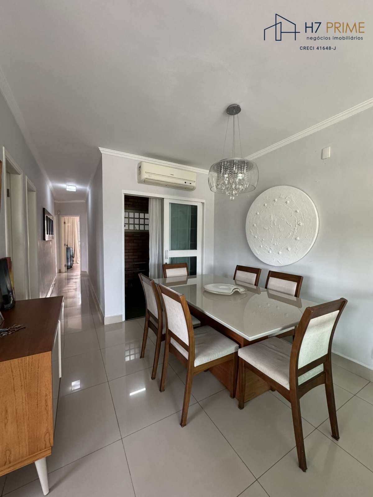 Sala integrada em 3 ambientes (estar, jantar e TV) com painel e sacada.